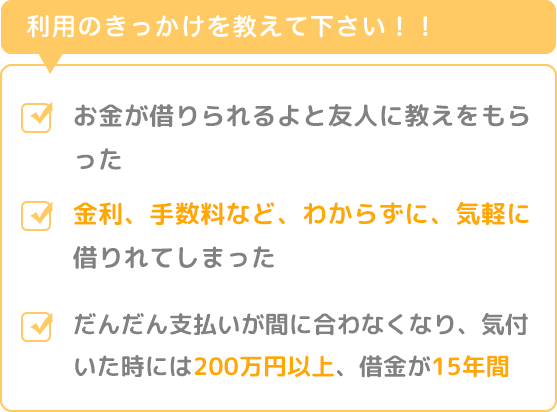 はじめの頃はバイト代が入ると返済していたのですが、だんだん間に合わなくなり、気付いた時には200万円以上、借金が15年間も続いていました。