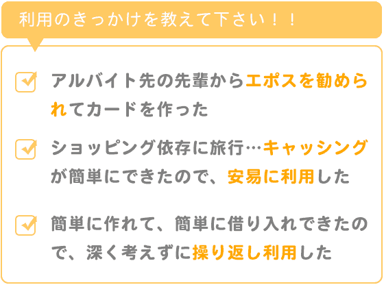 ①アルバイト先の先輩からエポスを勧められてカードを作ったのが利用のきっかけです。