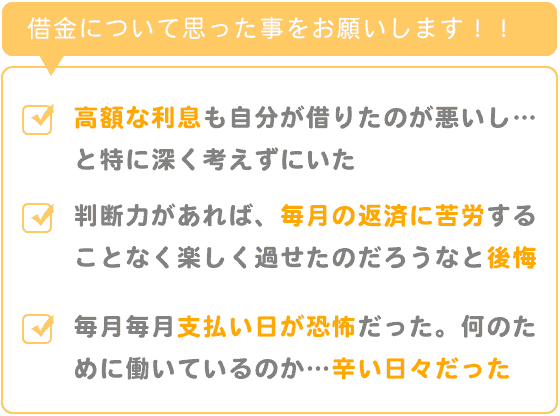 返済は大変でしたが、高額な利息も自分が借りたのが悪いし…と特に深く考えずにいました。