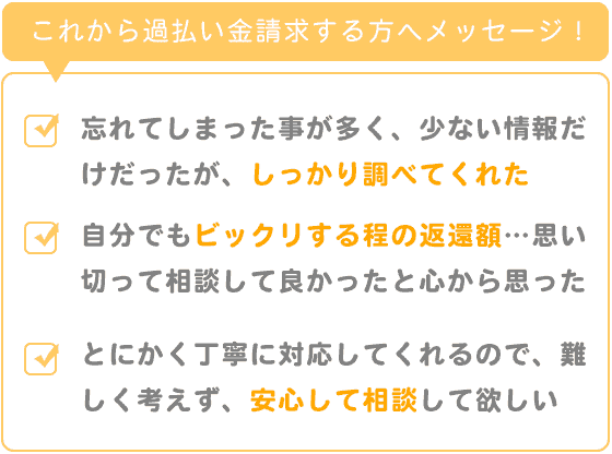 忘れてしまった事が多く、少ない情報だけでしたが、しっかり調べて下さって、自分でもビックリする程の金額が還ってくると伺った時にはダメ元でも、情報が少なくても思い切って相談して良かったと心から思いました。是非気軽に相談して欲しいです。