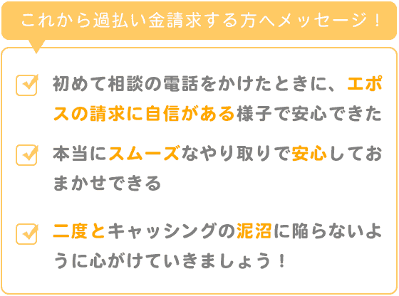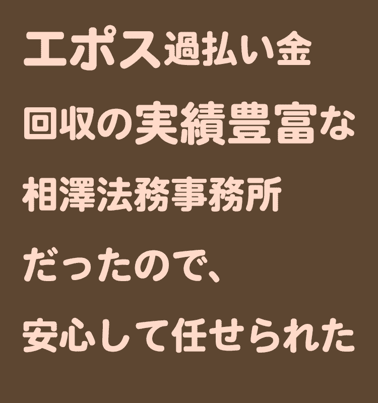 相澤法務事務所さんはエポスに関して、多くの実績があるらしく初めて相談の電話をかけたときに大変自信があるご様子で安心して依頼できました。