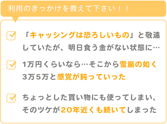 それまでは「キャッシングは恐ろしいもの」という思いがあり敬遠していたのですが、流石に明日食う金がないとなると話は別で、1万円くらいならいいだろうという思いになってしまいました。