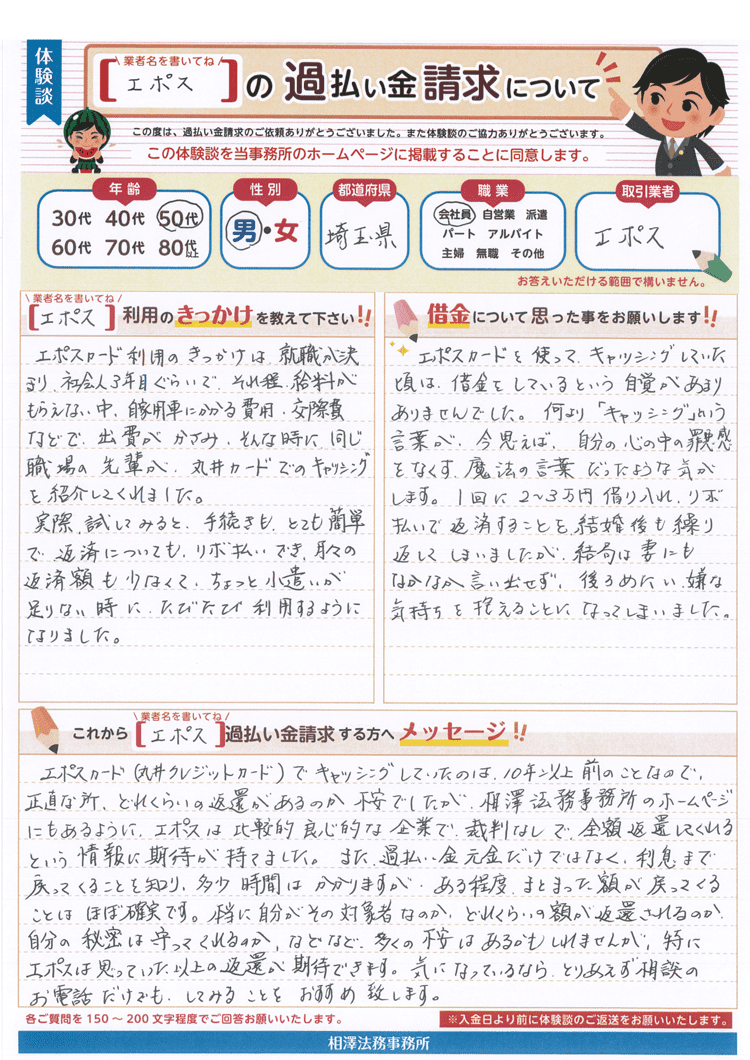 エポスカード(丸井クレジットカード)でキャッシングをしていたのは、10年以上前のことなので、正直な所、どれくらいの返還があるのか不安でしたが、相澤法務事務所のホームページにもあるように、エポスは比較的良心的な企業で、裁判なしで、全額返還してくれるという情報に期待が持てました。
