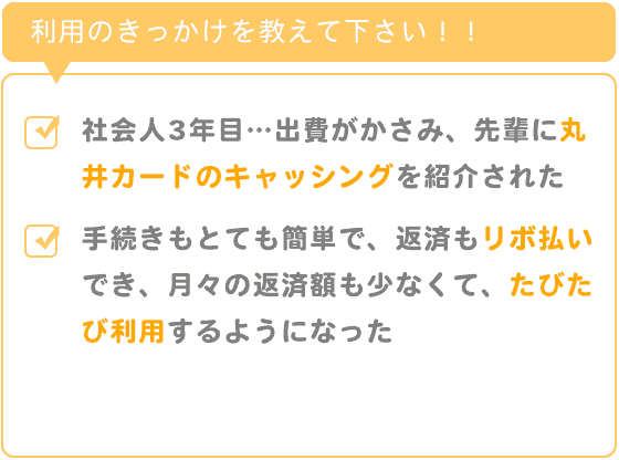 エポスカード利用のきっかけは、就職が決まり、社会人3年目ぐらいで、それ程、給料がもらえない中、自家用車にかかる費用、交際費などで、出費がかさみ、そんな時に同じ職場の先輩が、丸井カードでのキャッシングを紹介してくれました。