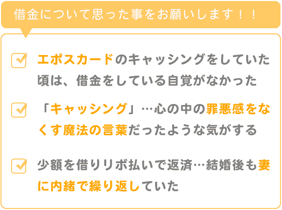 1回に2~3万円借り入れ、リボ払いで返済することを結婚後も繰り返してしまいましたが、結局は妻にもなかなか言い出せず、後ろめたい、嫌な気持ちを抱えることになってしまいました。