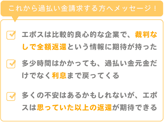 本当に自分がその対象なのか、どれくらいの額が返還されるのか、自分の秘密は守ってくれるのか、などなど、多くの不安はあるかもしれませんが、特にエポスは思っていた以上の返還が期待できます。