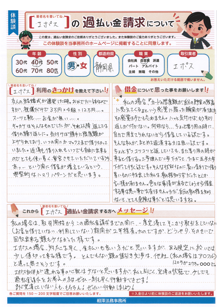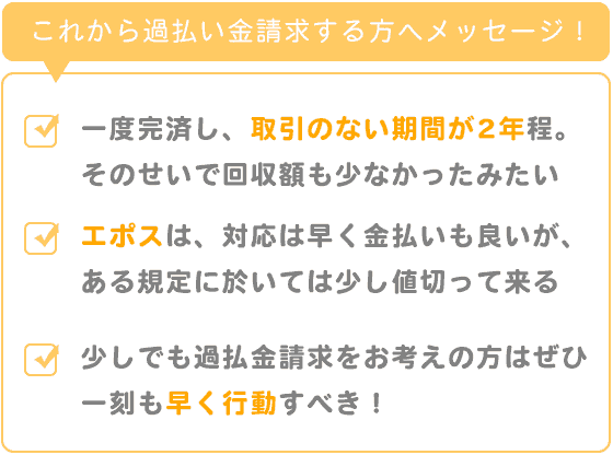 エポス自体が潰れる事の心配は少ないと思いますが、私と同じく、完済の状態で、少しでも過払金請求をお考えの方はぜひ一刻も早く行動すべきです!