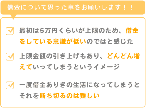 カードローンについては最初は5万円くらいが上限でありそれほど多額ではないため、借金をしているという意識が低いのではないかと感じます。