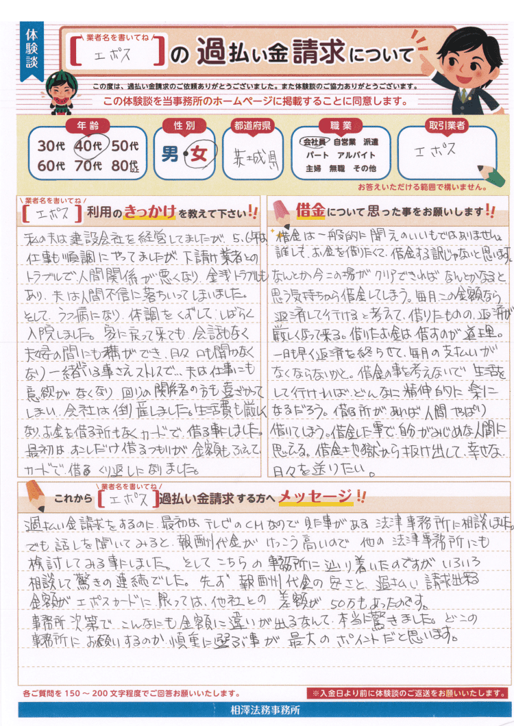 そしてこちらの事務所に辿り着いたのですがいろいろ相談して驚きの連続でした。先ず報酬代金の安さと、過払い請求出来る金額がエポスカードに限っては、他社との差額が50万もあったのです。事務所次第でこんなにも金額に違いが出るなんて、本当に驚きました。