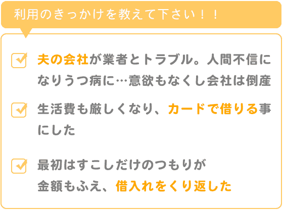 生活費も厳しくなり、お金を借りる所もなくカードで、借りる事にしました。最初はすこしだけ借りるつもりが金額もふえて、カードで借りるくり返しになりました。