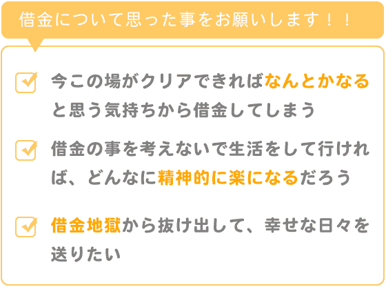 一日も早く返済を終わらせて、毎月の支払いがなくならないかと。借金の事を考えないで生活をして行ければ、どんなに精神的に楽になるだろう。