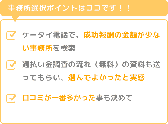 ケータイ電話で、成功報酬の金額が少ない事務所を検索していました。
