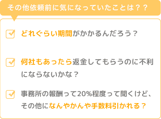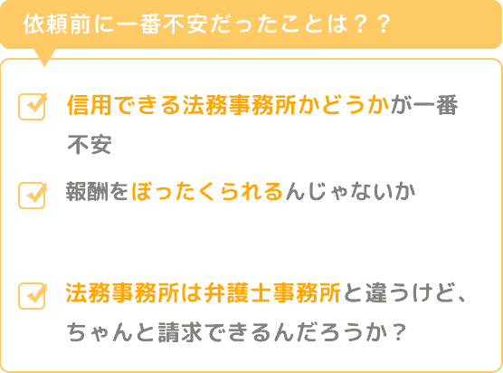 やはり、お金の事なので、信用できる法務事務所かどうかが一番不安に思うところでした。