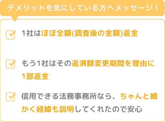 私の場合、数社借りて返済しましたが、返済中に相手(カード会社)に返済額を変更してもらった期間もあり、もしかしたら全部の会社から返金がないかもしれない…という不安もありましたが、1社はほぼ全額(調査後の金額)返金が有り、もう1社はその返済額変更期間を理由に1部返金となりました。