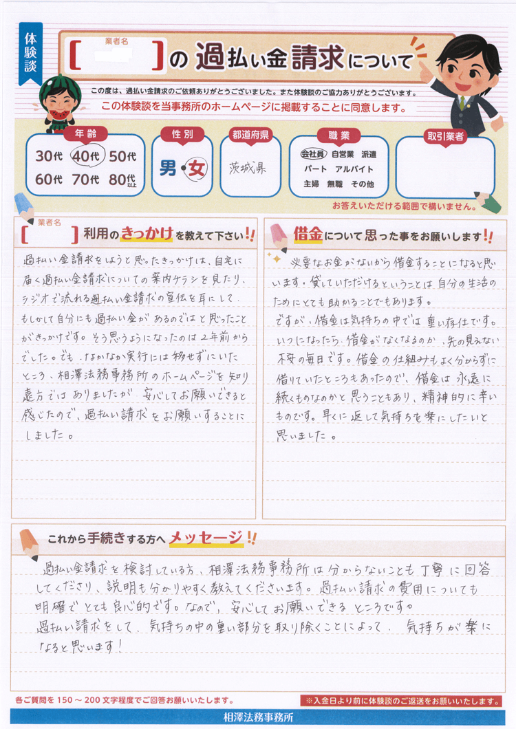 でも、なかなか実行には移せずにいたところ、相澤法務事務所のホームページを知り、遠方ではありましたが、安心してお願いできると感じたので、過払い請求をお願いすることにしました。
