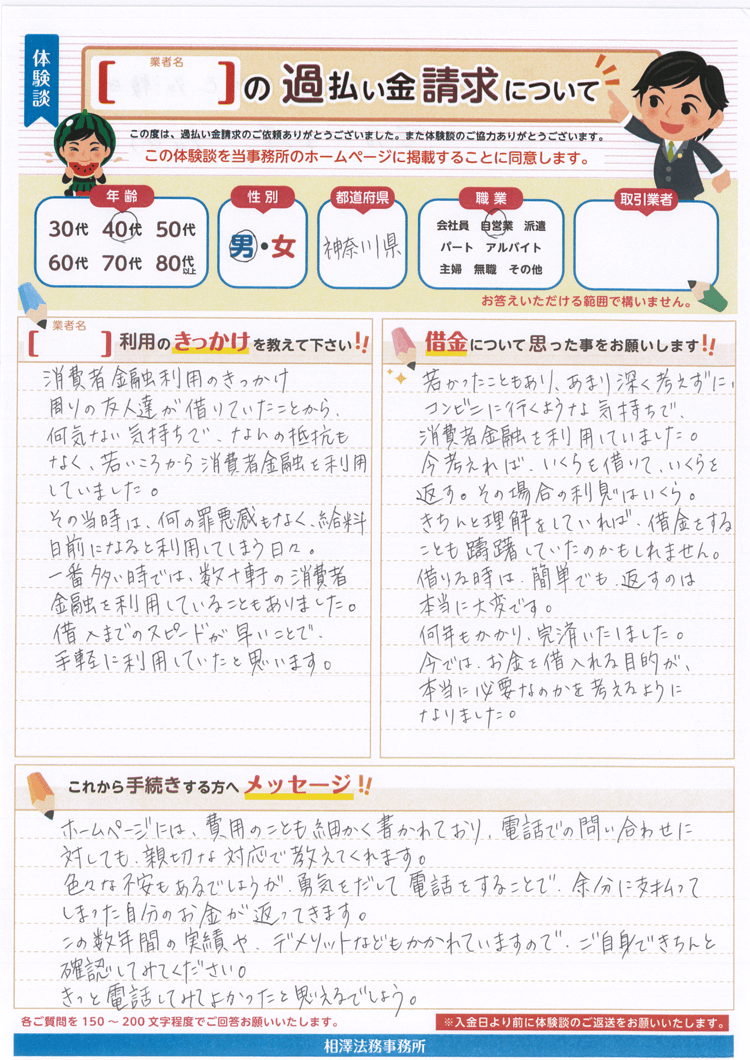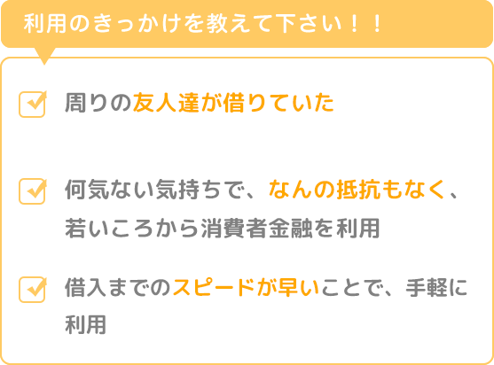 消費者金融利用のきっかけ周りの友人達が借りていたことから、何気ない気持ちで、なんの抵抗もなく、若いころから消費者金融を利用していました。