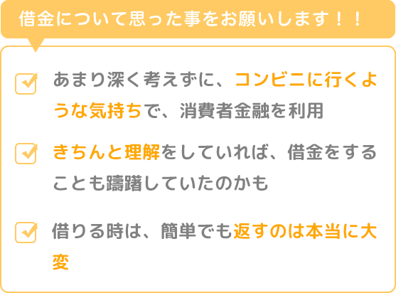 今では、お金を借入れる目的が、本当に必要なのかを考えるようになりました。