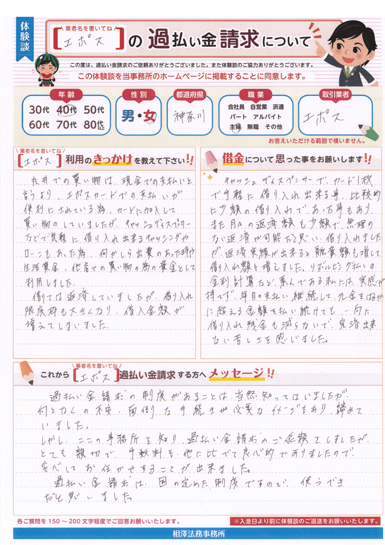 しかし、ここの事務所を知り、過払い金請求のご依頼をしましたが、とても親切で、手数料も、他に比べて良心的でありましたので、安心してお任せすることが出来ました。