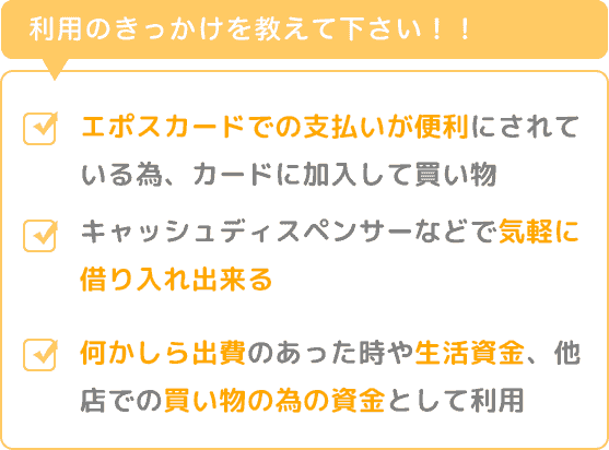 丸井での買い物は、現金での支払いと言うより、エポスカードでの支払いが便利にされている為、カードに加入して買い物のしていましたが、キャッシュディスペンサーなどで気軽に借り入れ出来るキャッシングやローンもあった為、何かしら出費のあった時や生活資金、他店での買い物の為の資金として利用しました。