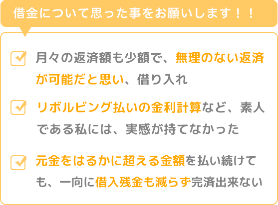 リボルビング払いの金利計算など、素人である私には、実感が持てず、毎月の支払い継続して、元金をはるかに超える金額を払い続けても、一向に借り入れ残金も減らないで、完済出来ない苦しさを感じました。