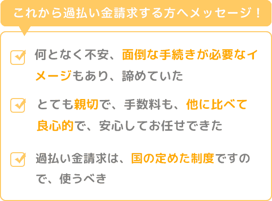 過払い金請求の制度があることは、当然知ってはいましたが、何となく不安、面倒な手続きが必要なイメージもあり、諦めていました。