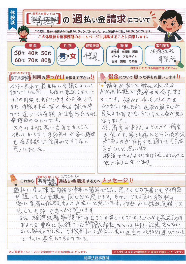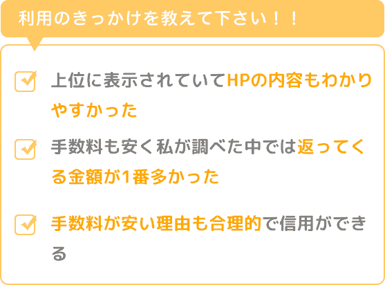 インターネットで過払い金請求について調べていた所、上位に表示されていてHPの内容もわかりやすかった為です。また、手数料も安く私が調べた中では返ってくる金額が1番多かったのも理由のひとつです。