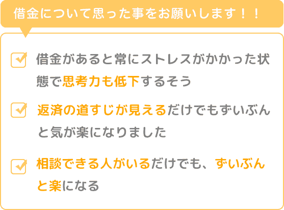 借金があると常にストレスがかかった状態で思考力も低下するそうです。確かに私もストレスをかかえていましたが、返済の道すじが見えるだけでもずいぶんと気が楽になりました。