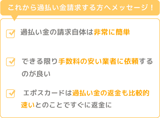 過払い金の請求自体は非常に簡単でした。恐らくどの業者でもやる内容や返ってくる金額も同じだと思います。なので、できる限り手数料の安い業者に依頼するのが良いと思います。