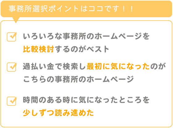 本当なら、いろいろな事務所のホームページ費用等をよく調べ、比較し、よく考えてというのがベストなカタチであったのかもしれませんが、私はマメな方ではないので、ひとまず過払い金で検索し最初に気になったこちらの事務所のホームページ、私が想像していたとおりのTVCM等でおなじみの大手事務所との違いから、時間のある時に気になったところを少しずつ読み進め、そのままWeb診断、現在にいたるといった感じですから、ある意味、私の場合は、ラッキーだったのかもしれません。
