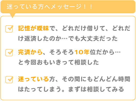 同じように利用していた時期、金額が不明瞭で過払い金が発生しているのか、時効に間に合うのか、などなど迷っている方、その間にも、どんどん時間はたってしまいます。まずは相談してみることをオススメします。