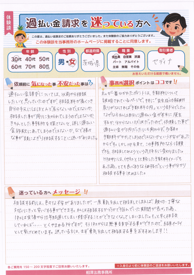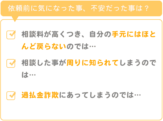 過払金請求については、以前から相談したいと思っていたのですが、相談料が高くつき自分の手元にはほとんど戻らないのではないか、相談した事が周りに知られてしまうのではないか、きちんとした事務所を探さないと、逆に過払金詐欺にあってしまうのではないか、など様々な事が頭によぎり相談することに迷いがありました。