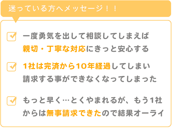 私は相談するかどうかで悩んでいた時期が長かった為、1社は完済から10年経過してしまい請求することができなくなってしまいました。