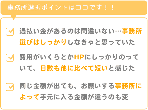 自分がココを知ったのはどこかのバナーでした。過払い金があるのはまちがいないと思っていましたが、事務所選びはしっかりしなきゃと思ってました。費用がいくらかかるのとか、法律で何%なのかとかくわしくかいてるホームページって少ないと思いますが、そんな所もしっかりのってたので決めました。後は、進みぐあいとかも何日ぐらいとか、他に比べて短いと感じたのもポイントでした。でも、一番は費用ですね。同じ金がくが出てもお願いする事務所によって手元に入る金がくが違うのも変なので。すみずみまで見てみると違いがわかります。