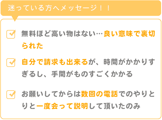 過払い金があるかどうかは調べてみないと分かりませんし、無料ほど高い物はないと思ってましたが、良い意味でうらぎられました。今、思えば、この費用で良いの?と思う事もあります。特に、完済してる人はやってみてほしいですね。自分にはないだろうと思っていても、あったりしますので。全て自分で請求も出来ますが、時間がかかりすぎるのと、手間がものすごくかかります。実際お願いしてからは数回の電話でのやりとりと一度会って説明して頂いたのみです。大阪と東京に事務所があるみたいなのですが、地方なので来ても頂けました。この点は大きいです。ダメで元々な感じでお願いしてみてはいかがでしょうか。