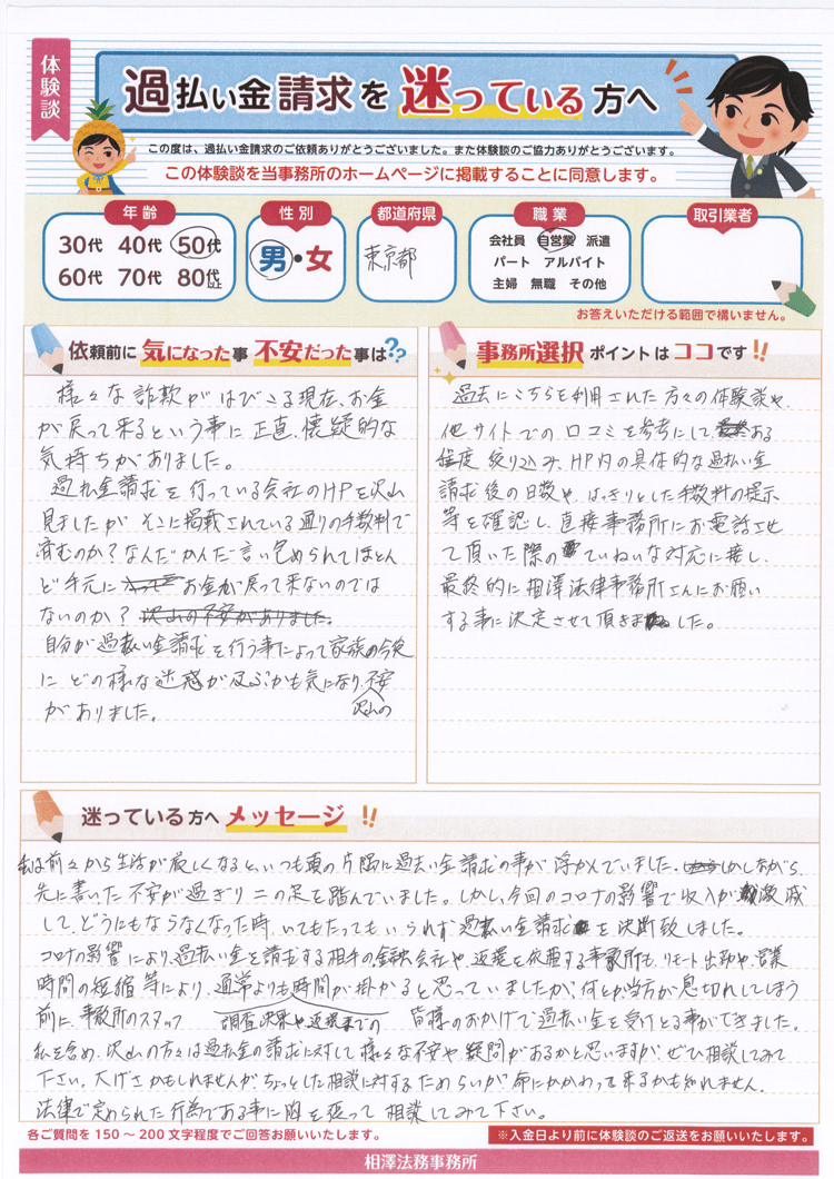 コロナの影響により、過払い金を請求する相手の金融会社や、返還を依頼する事務所もリモート出勤や営業時間の短縮等により、通常よりも調査決果や返還までの時間が掛かると思っていましたが、何とか当方が息切れしてしまう前に事務所のスタッフ 皆様のおかげで過払い金を受けとる事ができました。