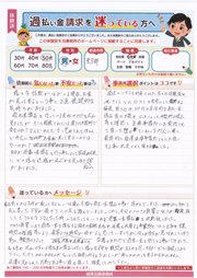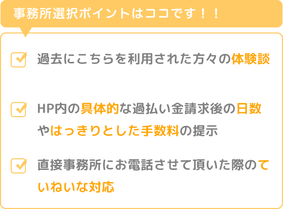 過去にこちらを利用された方々の体験談や、他サイトでの口コミを参考にしてある程度絞り込み、HP内の具体的な過払い金請求後の日数やはっきりとした手数料の提示等を確認し、直接事務所にお電話させて頂いた際のていねいな対応に接し、最終的に相澤法務事務所さんにお願いする事に決定させて頂きました。