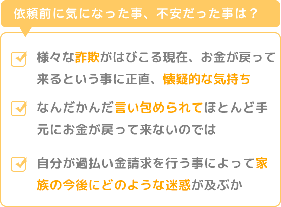 自分が過払い金請求を行う事によって家族の今後にどのような迷惑が及ぶかも気になり沢山の不安がありました。