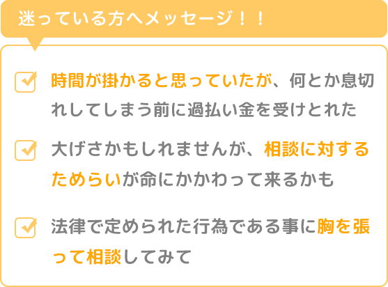 私を含め、沢山の方々は過払金の請求に対して様々な不安や疑問があるかと思いますが、ぜひ相談してみて下さい。