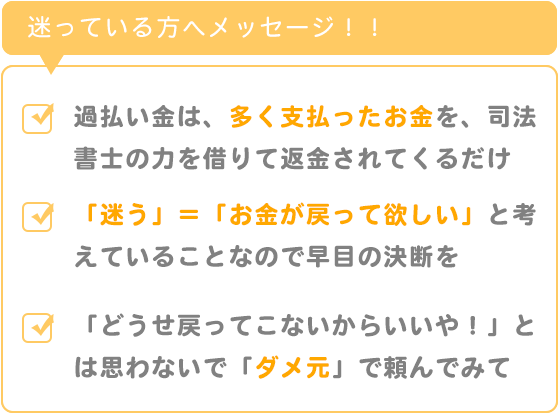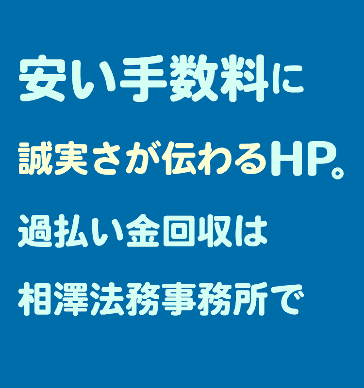 「過払い金」は自分自身が「カード会社」に多く支払いをしたお金を、司法書士さんの「力」を借りて返金されてくるだけですので、迷ってる方がいましたら是非「相澤事務所」に相談・申込みをすることをお勧めします。
