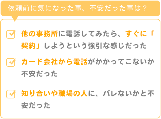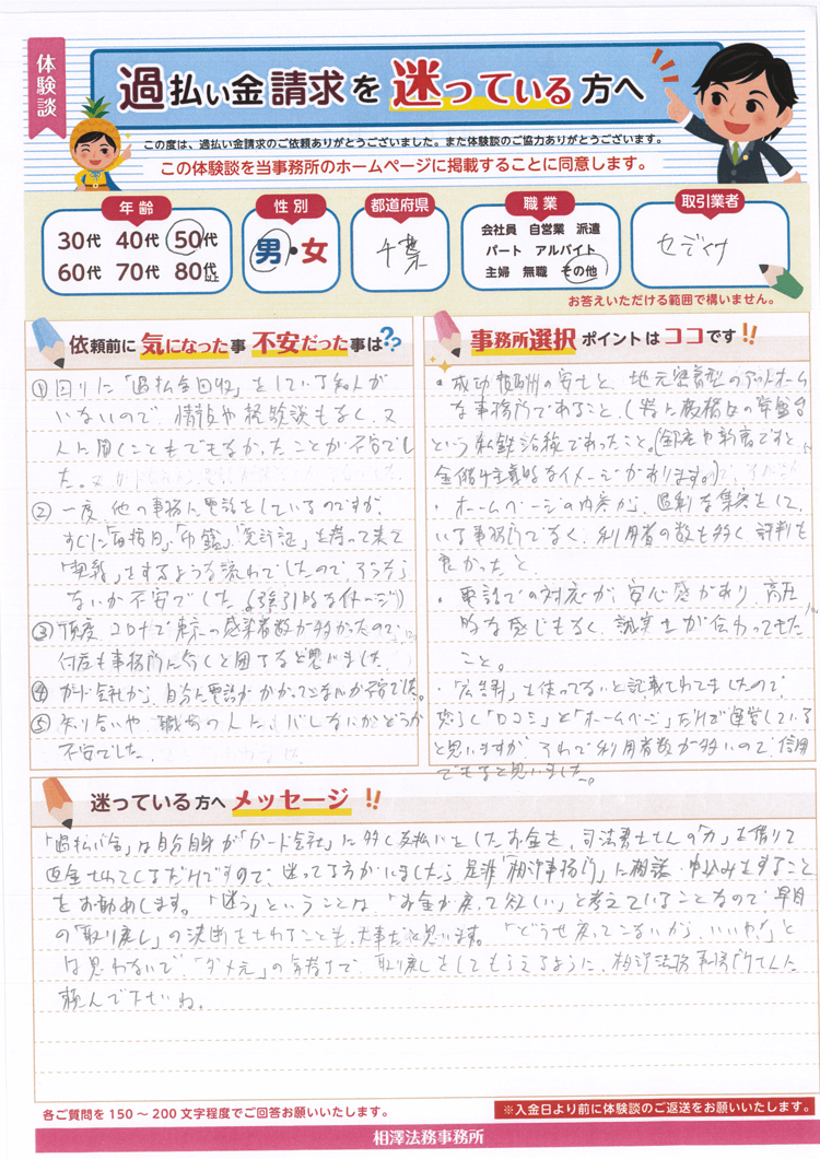 ①回りに「過払金回収」をしている知人がいないので情報や経験談もなく、又人に聞くこともできなかったことが不安でした。