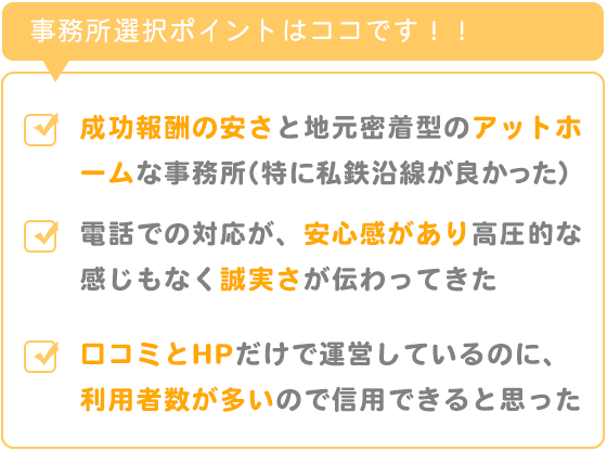 ・成功報酬の安さと地元密着型のアットホームな事務所であること(特に板橋区の常盤台という私鉄沿線であったこと。(銀座や新宿ですと金儲け主義的なイメージがあります。)