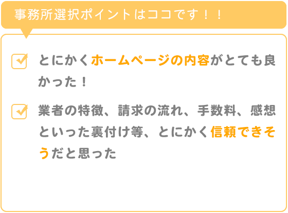 そこで他事務所の手数料も調べましたが、こちらも最終的な解決に導いてくれたのはホームページ内容で自社の明瞭な手数料表記・他事務所の手数料の仕組が丁寧に記されていました。