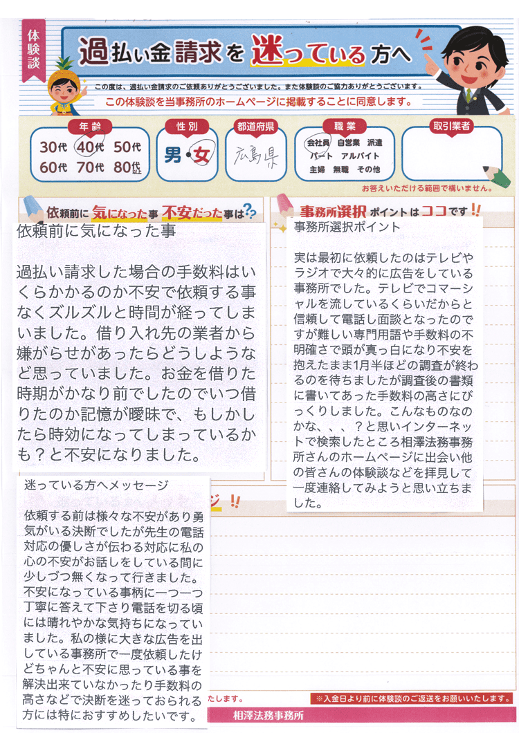 こんなものなのかな、、、?と思いインターネットで検索したところ相澤法務事務所さんのホームページに出会い他の皆さんの体験談などを拝見して一度連絡してみようと思い立ちました。