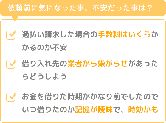 過払い請求した場合の手数料はいくらかかるのか不安で依頼する事なくズルズルと時間が経ってしまいました。借り入れ先の業者から嫌がらせがあったらどうしようなど思っていました。