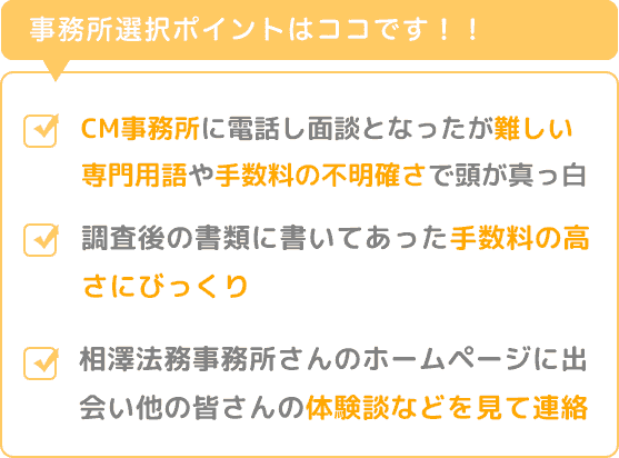 私の様に大きな広告を出している事務所で一度依頼したけどちゃんと不安に思っている事を解決出来ていなかったり手数料の高さなどで決断を迷っておられる方には特におすすめしたいです。