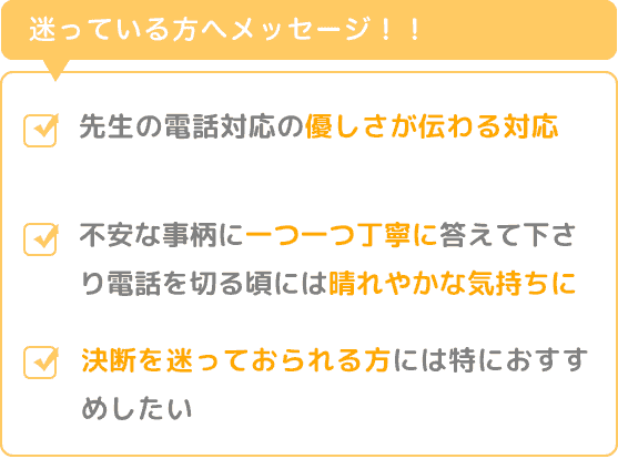 依頼する前は様々な不安があり勇気がいる決断でしたが先生の電話対応の優しさが伝わる対応に私の心の不安がお話しをしている間に少しづつ無くなって行きました。