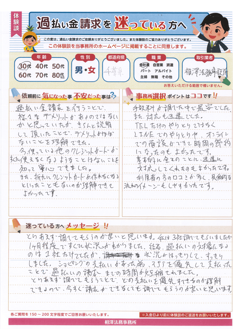 過払い金請求を行うことで、様々なデメリットがあるのではないかと思っていたが、きちんと説明して頂いたことで、デメリットがほぼないことを理解できた。