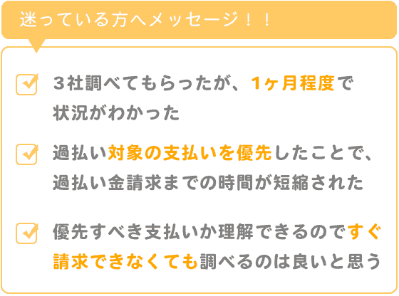 とりあえず調べてもらうことで、どの支払いを優先すべきなのか理解できるので、今すぐ請求ができなくても調べてもらうのが良いと思います。