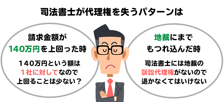 あるいは、簡易裁判所での審理で決着がつかず、地裁にまでもつれ込んだ場合も、自動的に司法書士は訴訟代理の立場から退かなければなりません。
