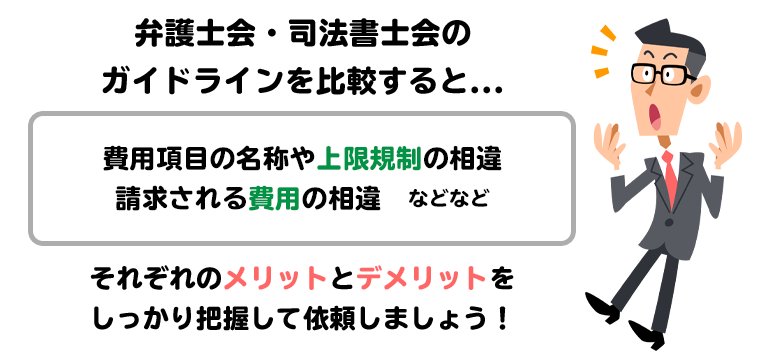 なお、弁護士会と司法書士会では、費用項目の名称や上限規制が異なります。それぞれの違いは次ぎのとおりです。